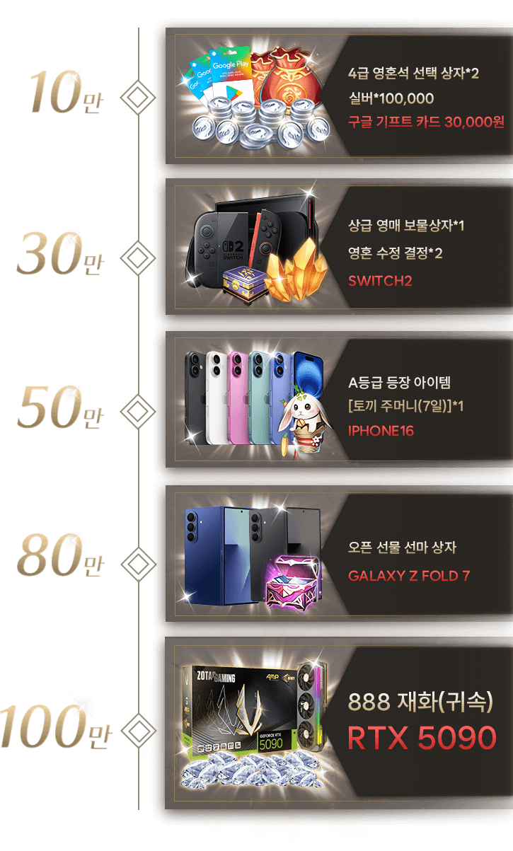 3. 실물 보상은 게임 출시 후 30영업일 이내에 커뮤니티를 통해 당첨자 명단을 공지하며, 전문 직원이 개별 통지 후 지급할 예정입니다.